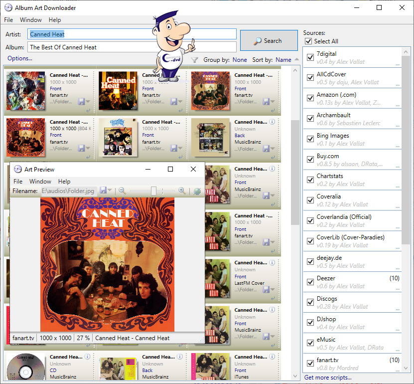 Ihr Medienplayer findet mal wieder kein Albumcover für Ihre neue Audio-CD? Oder Sie wollen das aktuelle Albumcover durch ein anderes ersetzen? Dafür eignet sich der Album Art Downloader (AAD) ganz hervorragend. Warum? Weil an die Anzahl der Quellen für Cover, die AAD bietet, derzeit vermutlich kein anderes Programm heranreicht. In der rechten Spalte können Sie aus weit über 20 Quellen (Sources) auswählen. Rechts unten gelangen Sie mit einem Klick auf "Get more scripts" zu weiteren Quellen. Als Suchbegriff geben Sie den Künstler- und/oder Albumnamen ein. Die Ergebnisse lassen sich nach bestimmten Kriterien sortieren und gruppieren (Group by und Sort by). Klicken Sie auf eines der gefundenen Cover mit der rechten Maustaste. "Preview" bietet Ihnen eine Vorschau und mit "Save" bzw. "Save as" speichern Sie das Cover im Standardverzeichnis, das Sie über Options ändern können (Save images to:).