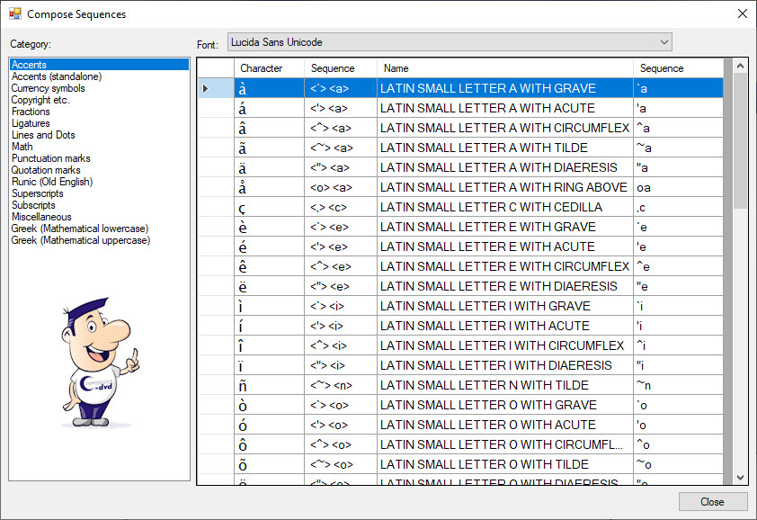 AllChars ist eine Erweiterung der Zeichentabelle, mit der Sie Sonderzeichen wie Á á À à in beliebige Anwendungen einfügen. Im Trayicon-Kontextmenü gelangen Sie zu den Einstellungen (Configuration). Unter "Key to use as" legen Sie die "Auslösertaste" fest. Dabei sollten Sie eine selten verwendete bevorzugen, damit es keine Konflikte mit anderen Tastenfunktionen gibt.