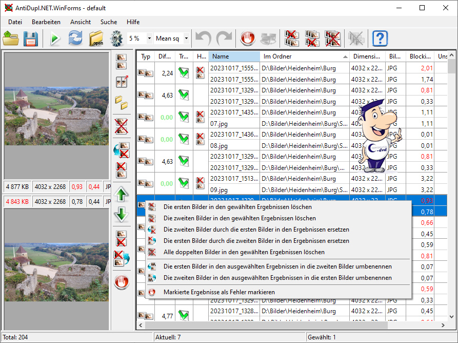 AntiDupl sucht in Verzeichnissen nicht nur nach absolut identischen Bildern, sondern es wertet auch solche als Duplikat, die Abweichungen im Dateinamen oder in der Bild- oder Dateigröße aufweisen. Auch Bilder mit kleineren Fehlern, sowie gedrehte oder gespiegelte Bilder gehören dazu. In der Ergebnisliste weist die Spalte Differenz auf Abweichungen hin, wobei "0,00" völlige Übereinstimmung bedeutet. Details zu den Modifikationen legen Spalten wie Transformation, "Dimensionen", "Größe" und "Bildtyp" offen. In den Optionen lassen sich einzelne Vergleichsfilter deaktivieren (Optionen - Vergleichen). Im Ansicht-Menü unter "Spalten auswählen" werden Spalten in der Ergebnisliste entfernt bzw. aktiviert.