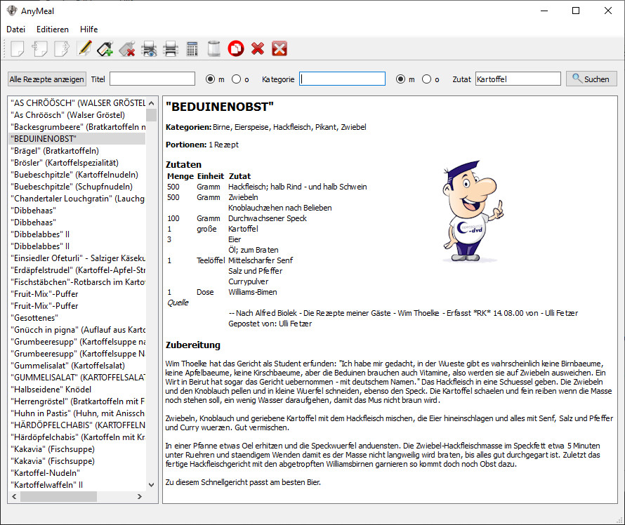 stehen zum Download bereit. Nach dem Entpacken der Datei deutsche-rezepte.zip importieren Sie die "rezepte.mm" über das Dateimenü. Die Suchfunktion bietet die miteinander kombinierbaren Filter Rezepttitel, Zutat und Kategorie. Die Stärke der reinen Text-Datenbank ist ihre fast unbegrenzte Kapazität. Mit der Druckvorschau lässt sich feststellen, ob der eigentliche Ausdruck Ihren Vorstellungen entsprechen würde. Für den Export eines oder mehrerer Rezepte wird auch das MealMaster-Format (MMF) unterstützt.