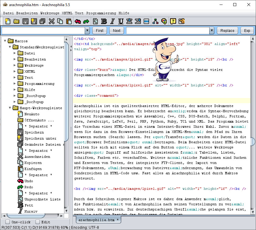 Durch das Schreiben eigener Makros ist es daher dem Anwender möglich, die Funktionalität von Arachnophilia nach seinen Vorstellungen zu verändern bzw. zu erweitern. Zur deutschsprachigen Oberfläche gelangen Sie erst, wenn Sie nach dem Beenden des Programms die Dateien