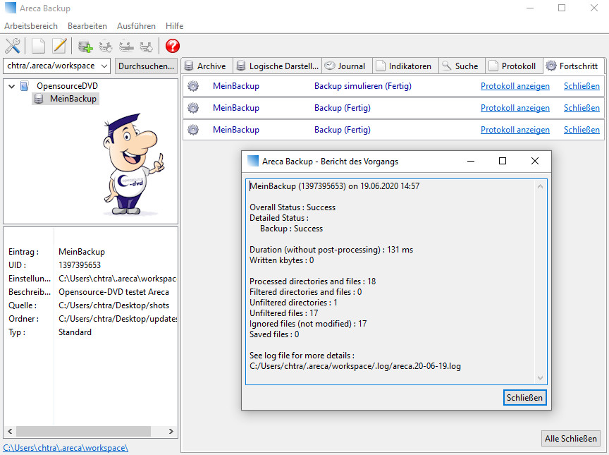 Durch Filter können Sie bspw. bestimmte Dateitypen von der Sicherung ausschließen. Unter Nachbearbeitung ist es u. a. möglich, sich den Backupreport per Email zusenden zu lassen. Im Ausführen-Menü können Sie zunächst das Backup simulieren. Starten Sie dann das richtige Backup, wenn die Projekteinstellungen korrekt sind. Das Zurückholen gesicherter Dateien erreichen Sie mit "Dateien wiederherstellen" im Ausführen-Menü. Areca bietet (noch) keine automatische zeitgesteuerte Sicherung. Ist bei Ihnen eine 64-bit JAVA-Umgebung installiert, dann sollten Sie die