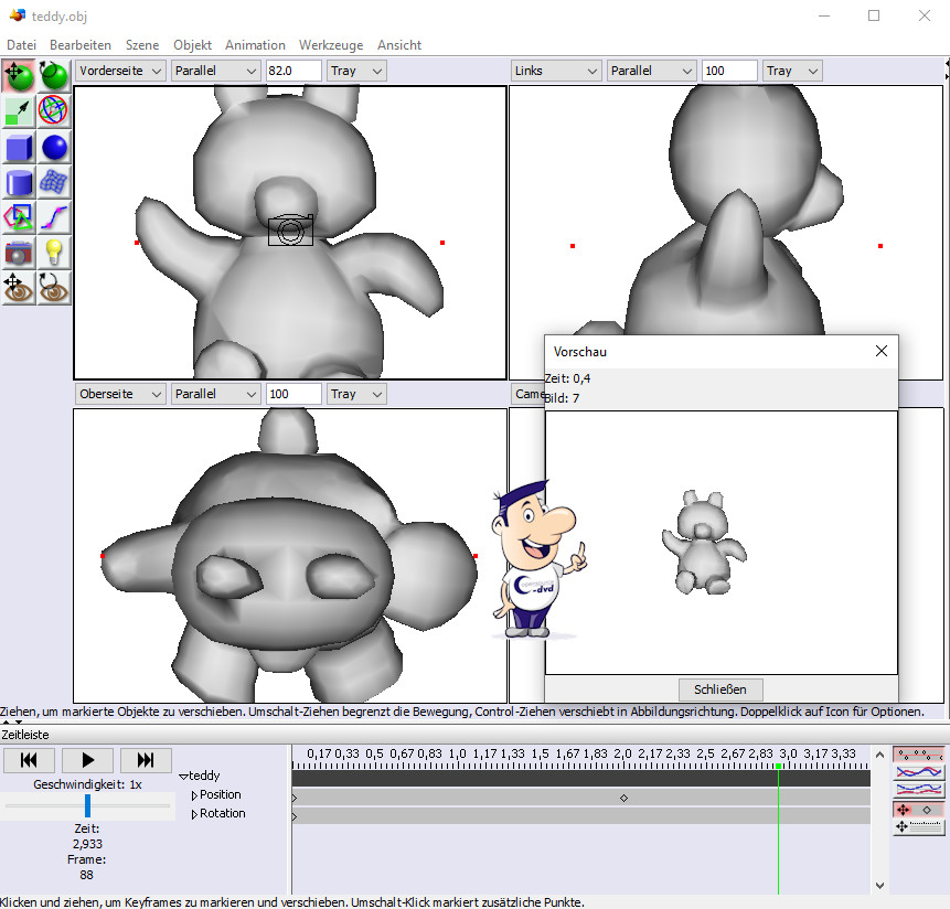 Mit Art of Illusion modellieren, rendern und animieren Sie dreidimensionale Körper. Das Programm bietet neben einem Objekt- auch einen Textur- und Materialien-Editor. Die Objekt-Liste rechts dient der schnellen Auswahl einzelner Komponenten. Durch Art of Illusion sind Sie imstande, sehr komplexe Animationen zu erstellen! Wie Sie jedoch schnell eine ganz simple Animation gestalten, möchten wir Ihnen kurz erläutern. Sie haben ein Bild mit mehreren Objekten geöffnet. Ein Objekt soll von einem Ort zu einem anderen wandern und wieder zurück. Zunächst müssen Sie über das Menü Animation die Zeitlinie anzeigen lassen. Schieben Sie den grünen Regler auf 0, dem Ausgangspunkt der Animation und setzen mit Animation - "Keyframe geänderte Spuren markierter Objekte" einen Keyframe. Sie können jetzt ein Objekt markieren und verschieben. Danach ziehen Sie den grünen Regler auf einen Zeitwert wie 2,0 Sekunden. Setzen Sie hier wie gehabt einen Keyframe. Das verschobene Objekt muss nun zur Ausgangsposition zurück. Danach den grünen Regler auf 4,0 Sekunden und die Änderung erneut mit einem Keyframe festhalten.