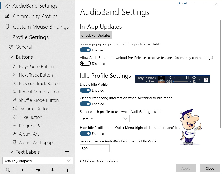 Die Eigenschaften (AudioBand Settings) des Tools rufen Sie mit einem Rechtsklick auf. In den "Profile Settings" passen Sie das Aussehen der einzelnen Module an. Bereits vordefinierte Profile finden Sie unter "Profiles" sowie auf der Community-Seite. Wenn Sie zur Wiedergabe Spotify, iTunes oder Music Bee nutzen, müssen Sie im Bereich "Audio sources" die entsprechende Quelle festlegen. Ansonsten arbeitet AudioBand mit den meisten Medienplayern über "Windows 10" zusammen. Bei der "Windows Medienwiedergabe" unterstützt es auch Videos.