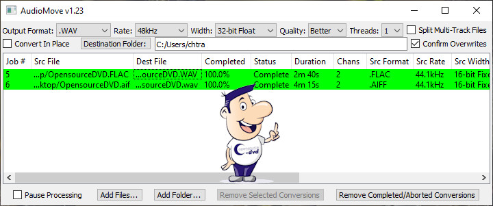 AudioMove konvertiert Audioformate, die in den meisten Fällen eher ein unscheinbares Dasein fristen. Darunter sind Typen wie AIFF/AIFC, AU/SND, FLAC, IFF, PAF, PVF, RAW und VOC. Als Zielformat stehen Formate wie WAV, AIFF, PAF, W64, CAF, RF64, OGG, OPUS, oder FLAC zur Verfügung. Per Drag & Drop oder über "Add Files" bzw. "Add Folder" werden die Dateien in die Jobliste übertragen und sofort umgewandelt.