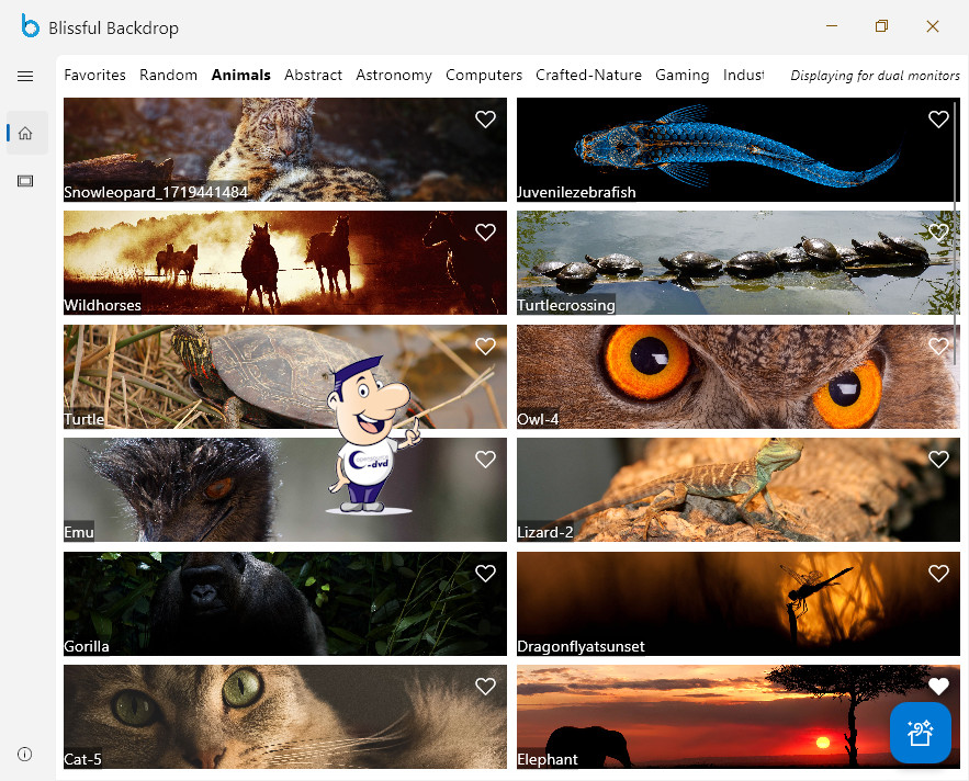 Blissful Backdrop beschenkt Nutzer mehrerer Monitore mit zahlreichen, hochauflösenden Hintergrundbildern. Sie sind Kategorien wie Tiere, Natur, Mikroskopie, Industrie, Computer, Astronomie und Science-Fiction zugeordnet. Nach nur einem Mausklick auf das Vorschaubild wird das Original in der passenden Auflösung heruntergeladen und als neues Hintergrundbild eingerichtet.