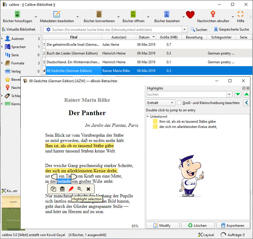 Er importiert Formate wie AZW4, CBZ, CBR, CBC, DOCX, EPUB, HTML, LIT, LRF, MOBI, ODT, PDF, PRC, PDB, PML und TXT. Mit Calibre können Sie nach Ebooks bei Online-Anbietern wie Amazon.de und Ebook.de suchen sowie "Nachrichten abrufen", die News-Portale im EBook-Format zum Herunterladen bereitstellen. Das eBook-Programm besitzt eine eingebaute Serverfunktion, mit der man den externen Zugriff ermöglichen und so von überall auf die am PC gespeicherten eBooks zugreifen kann.