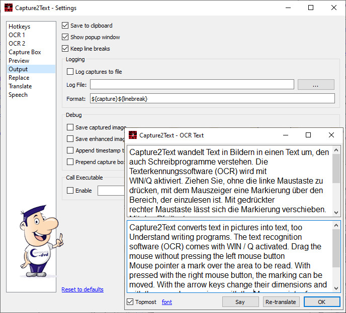 Nach einem Klick mit der linken Maustaste beginnt das Umwandeln. Ausgegeben wird der Text je nach Wunsch in die Zwischenablage, in ein Popup-Fenster und an die letzte Cursorposition. In den Eigenschaften (Settings) können Sie im Replace-Register festlegen, dass ein bestimmter Text, der erkannt wird, von Capture2Text automatisch durch einen anderen ersetzt werden soll. Im Translate-Register aktivieren Sie bei Bedarf die integrierte Schnittstelle zum Google Übersetzer. Danach erhalten Sie Übersetzungsvorschläge für eingelesene Texte. Auf Wunsch werden Ihnen die Texte auch vorgelesen (Speech).