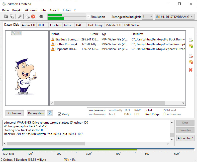 cdrtfe brennt Ihre Daten auf CD, DVD, DL-DVD oder Blu-ray und erstellt bzw. schreibt Image-Dateien (ISO, CUE/BIN). Außerdem unterstützt es Multisession-Disks und das Einrichten einer Boot-CD. Zuerst wählen Sie eines der Register Daten-Disk, Audio-CD, XCD, Disk-Image, (S)Video-CD oder DVD-Video aus. Danach fügen Sie per Drag & Drop oder über den vorgesehenen Button die Dateien in die Auftragsliste ein. Für eine Audio-CD importiert cdrtfe die Formate OGG, WAV, APE, Flac und MP3. Vor dem Brennen sollten Sie in den Optionen weitere Feineinstellungen vornehmen. XCD ist ein CD-Container, der alle Arten von Audio- und Videodateien aufnimmt. Er nutzt den Platz auf einer CD, der normalerweise für die Fehlerkorrektur reserviert ist. Dadurch können statt 700 etwa 800 MB genutzt werden.