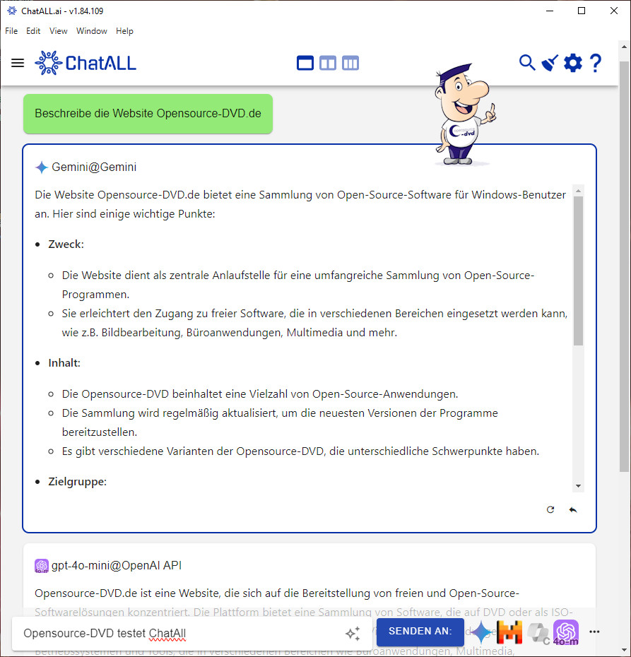 Ein KI-Chatbot ermöglicht Ihnen die Kommunikation mit Künstlicher Intelligenz. Sie übermitteln Ihr Anliegen, Ihre Frage oder einen Befehl. Je nach Vorgabe erhalten Sie als Antwort bspw. Wetterdaten, News, Hintergrundinformationen, Datenanalysen, mathematische Lösungen, Texte wie Geschichten, Aufsätze, Gedichte, Briefe und Übersetzungen. Die Anwendungsmöglichkeiten sind nahezu unbegrenzt. KI-Chatbots können sich anhand jedes "Gesprächs" selbstständig weiterentwickeln, weshalb mit der Zeit die Antworten immer ausgereifter werden. Jeder Chatbot hat seine eigenen Stärken und Schwächen. Daher ist es sehr sinnvoll, ChatALL zu nutzen, welches gleichzeitig mehrere Bots abfragt und die Antworten parallel ausgibt. Geben Sie in das untere Eingabefeld Ihre Anfrage und klicken auf "Senden an". Die Ergebnisse lassen sich auf bis zu drei Spalten verteilen.
