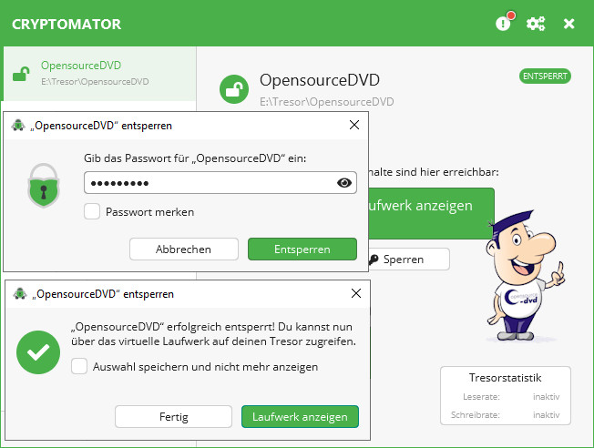 Als Zielort werden auch in Ihrem System eingebundene Cloud-Speicher wie Dropbox, OneDrive und Google Drive unterstützt. Damit Sie im neuen Tresor etwas ablegen können, muss er durch Eingabe des Passworts geöffnet bzw. entsperrt werden. Danach steht ein neues, virtuelles Laufwerk für die Aufnahme Ihrer Dateien so lange bereit, bis Sie ihn wieder schließen bzw. sperren. In den Tresoroptionen bestimmen Sie ggf. selbst den Laufwerksbuchstaben, ändern den Tresornamen oder das Passwort und lassen den Tresor nach x-Minuten Inaktivität automatisch sperren.