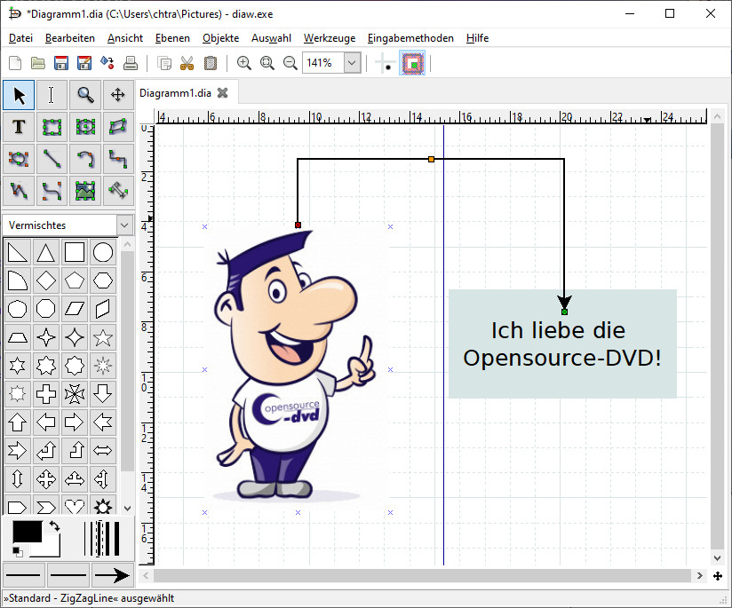 Mehrere Objekte markieren Sie übrigens mit der gedrückten Shift-Taste. Die Layertechnik erlaubt die Verwendung mehrerer Ebenen. Dia erlaubt das simultane Bearbeiten mehrerer Projekte, die jeweils in einem eigenen Fenster verwaltet werden. Ihre Diagramme lassen sich u. a. in das DXF-Format exportieren.