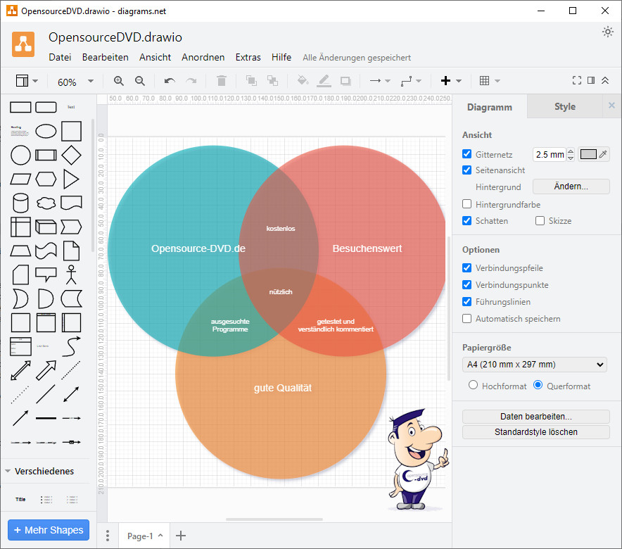 Mit diagrams.net visualisieren Sie Ideen, Daten, Abläufe, Strukturen und vieles mehr. Starten Sie mit einem leeren Blatt oder nutzen eine der zahlreichen Vorlagen aus Bereichen wie Business, Technik, Software, Netzwerk und Layout sowie UML-Diagramme. Links vom Arbeitsbereich warten Symbole und Formen auf ihren Einsatz. Rechts passen Sie die Stil- und Texteigenschaften an. Die Arbeitsoberfläche selbst lässt sich ggf. in ein Whiteboard verwandeln (Extras - Design - Skizze). Weitere Features sind: Hinzufügen von Text zu Formen und Verbindungslinien, Formen gruppieren, mit Ebenen arbeiten, mathematische Schriftsatzbibliothek, freihändiges Zeichnen, interaktive Formen, Tabellen erstellen usw.