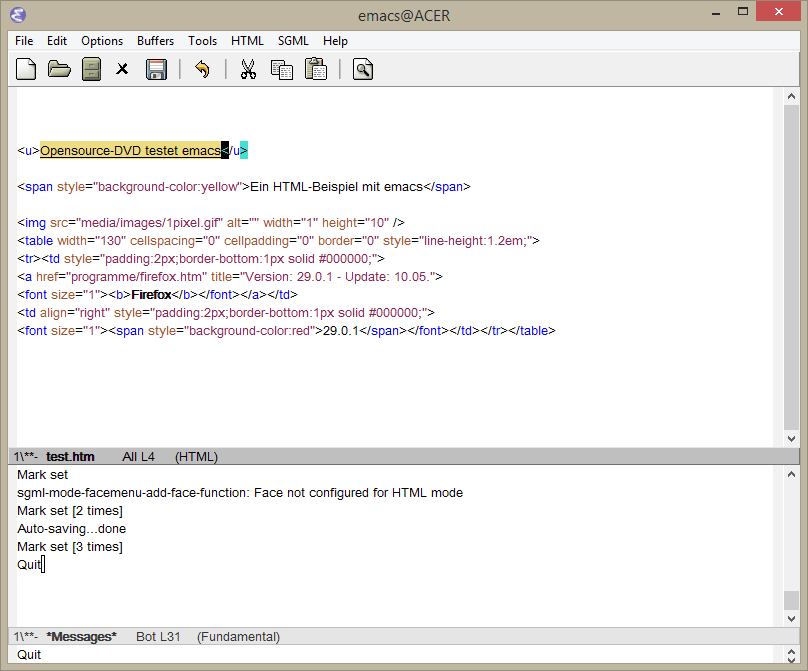 Sie zeigt den Dateinamen und diverse Angaben über den Zustand der Datei und die Arbeitsweise des Programmes. Die Systemzeile ist reserviert für Meldungen und die Eingabe eines Befehls. Über das Edit-Menü können Sie Text suchen und ersetzen lassen, zu einer bestimmten Zeile springen und Lesezeichen im Dokument setzen (Set Bookmark). In den "Text Properties" ändert man u. a. Schriftart und -farbe. Zum Anlegen einer Farbe geben Sie in der Systemzeile wie unter HTML einen entsprechenden Code wie #FF0000 oder als Name Red ein.