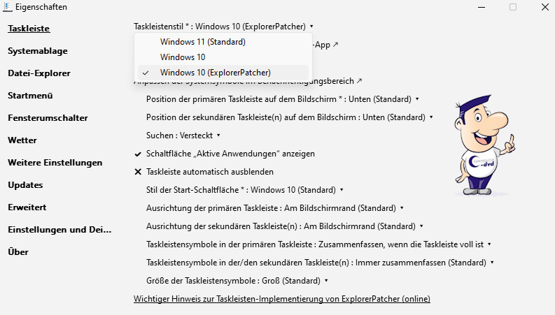 Das Kontextmenü der Taskleiste bietet auch wieder die Möglichkeit, Symbolleisten (Ordner) in der Taskleiste abzulegen. Hier gelangen Sie auch zu den Explorer Patcher "Eigenschaften" mit zahlreichen Anpassungsmöglichkeiten. Nach der Installation wird auch eine Verknüpfung angelegt, über die Sie den Explorer Patcher deaktivieren können.
