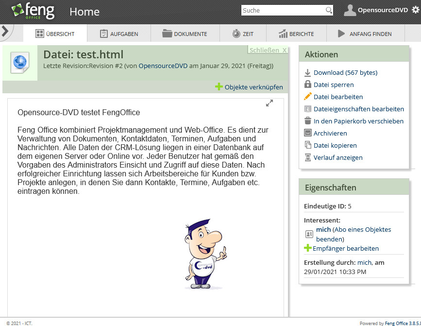 Feng Office kombiniert Projektmanagement und Web-Office. Es dient zur Verwaltung von Dokumenten, Kontaktdaten, Terminen, Aufgaben und Nachrichten. Alle Daten der CRM-Lösung liegen in einer Datenbank auf dem eigenen Server oder Online vor. Jeder Benutzer hat gemäß den Vorgaben des Administrators Einsicht und Zugriff auf diese Daten. Nach erfolgreicher Einrichtung lassen sich Arbeitsbereiche für Kunden bzw. Projekte anlegen, in denen Sie dann Kontakte, Termine, Aufgaben etc. eintragen können. Außerdem ist es möglich, Dokumente hochzuladen. Feng Office muss auf einem Webserver mit PHP- und MySQL-Unterstützung installiert werden. Damit Sie Feng Office offline verwalten können, müssen Sie zusätzlich