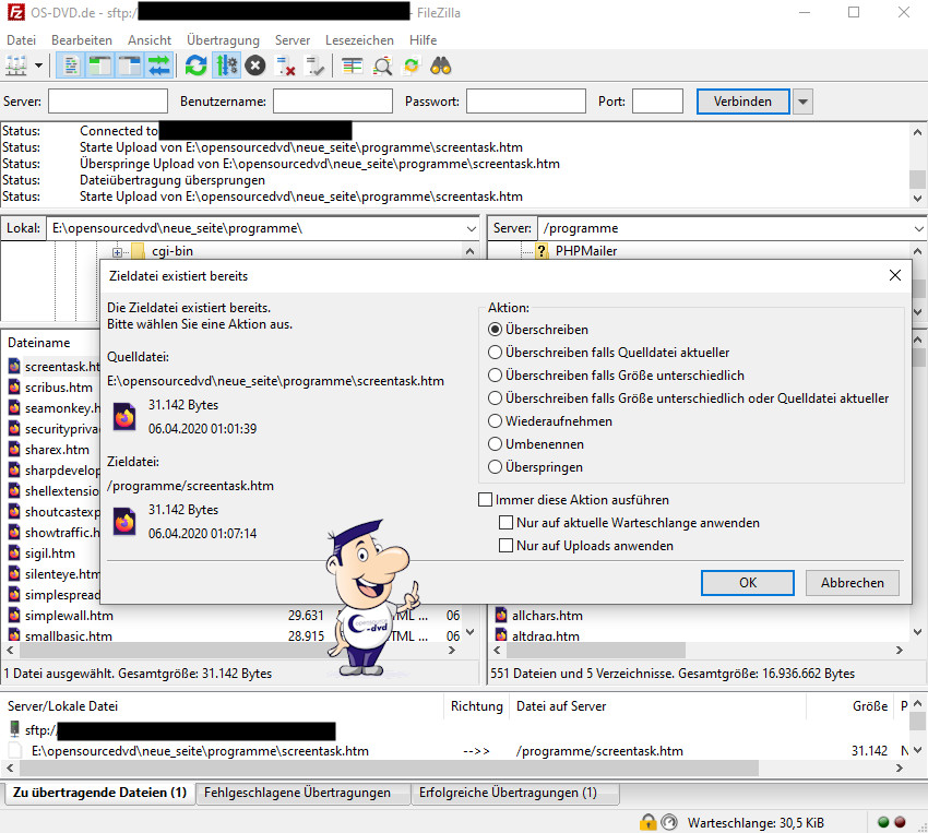 Wird ein Transfer aus irgendwelchen Gründen vorzeitig abgebrochen, so erlaubt Ihnen FileZilla, den Transfer dort wieder fortzusetzen! Dateien und Ordner können Sie außerdem in eine Warteschlange stellen, deren Inhalt im unteren Fensterbereich aufgelistet wird. Von hier können Sie zu einem späteren Zeitpunkt den Download veranlassen.