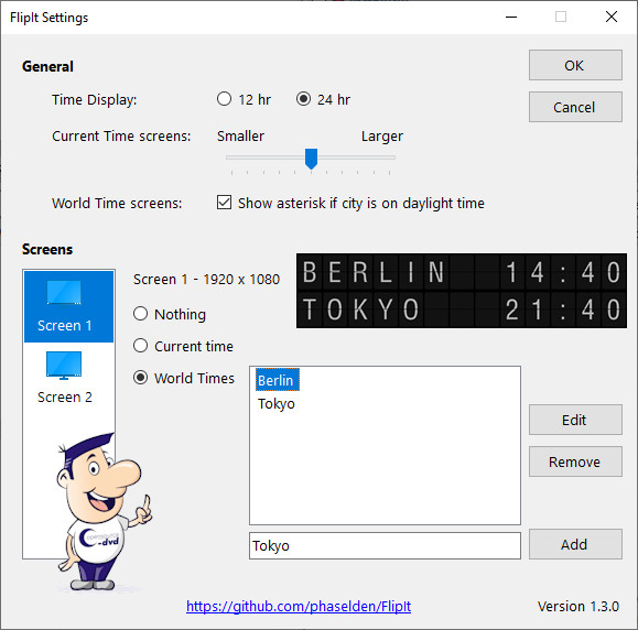 Von welchen Städten die Uhrzeit erscheint, bestimmen Sie ggf. über World Times. Tragen Sie dazu im unteren Feld bspw. Sydney ein und klicken auf den Add-Button. Auf diese Weise lassen sich mehrere der Liste hinzufügen. Gibt es hier keine Einträge, wird eine Standardliste verwendet. Anwender, die zwei Monitore nutzen, können für jeden eigene Einstellungen vornehmen.