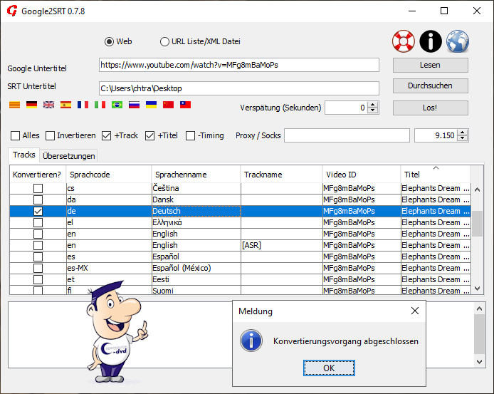 Kopieren Sie im Browser die Internetadresse und fügen Sie in die erste Zeile (Google Untertitel) ein. Nach dem Klick auf den Lesen-Button werden die Sprachen aufgelistet, in denen Untertitel vorhanden sind. Wählen Sie die deutsche Sprache aus und klicken auf den Los-Button. Nun wird eine SRT-Datei mit den deutschen Untertiteln erzeugt, die für einen Videoplayer wie dem