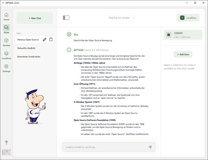 bietet GPT4All eine rein lokale Lösung. Dadurch vermeiden Sie es, dass Ihre Eingaben auf den Servern Cloud-basierter Chatbots wie ChatGPT von OpenAI landen, dort verarbeitet und gespeichert werden. Damit das funktioniert, müssen Sie mindestens ein KI-Sprachmodell (LLM: Large Language Model) herunterladen. Dazu klicken Sie im Models-Bereich auf "Add Model" und wählen e.g. Llama 3.2 3B. Zu jedem Modell werden dessen Stärken und auch Anforderungen an Ihre Hardware aufgelistet. Ab sofort können Sie mit der KI im Chats-Bereich kommunizieren, die Sie im oberen Bereich aktiviert haben. Ihre Chats werden sinnvollerweise lokal gespeichert und können über die linke Spalte wieder aufgerufen werden. Der jeweilige Chat-Name lässt sich ggf. ändern. Lassen Sie sich allgemeine Fragen beantworten, Briefe, Gedichte oder Songtexte entwerfen oder beim Programmieren helfen. Die Anwendungsmöglichkeiten sind nahezu unbegrenzt.