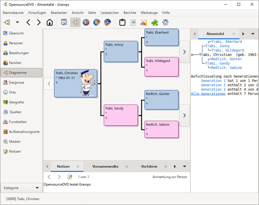 Klicken Sie sie jeweils mit der rechten Maustaste an und verknüpfen sie über "Hinzufügen" und dem Handsymbol mit Ihrem Vater bzw. Ihrer Mutter. Zum Neuanlegen dieser Vorfahren verwenden Sie das Pluszeichen. Sie können so weitere Verästelungen in Ihre Ahnengalerie integrieren. In der Fußleiste fügen Sie bei Bedarf Gramps-Module (Gramplets) wie einen Kalender, Notizen, eine Ahnentafel, Altersstatistiken und mehr hinzu. Zahlreiche Erweiterungen stehen im Menü zum Installieren bereit. Für den Export Ihrer Ahnengalerie stehen Formate wie VCF, WFT (Web Family Tree), GED (Gedcom), CSV und GW (GeneWeb) zur Auswahl.