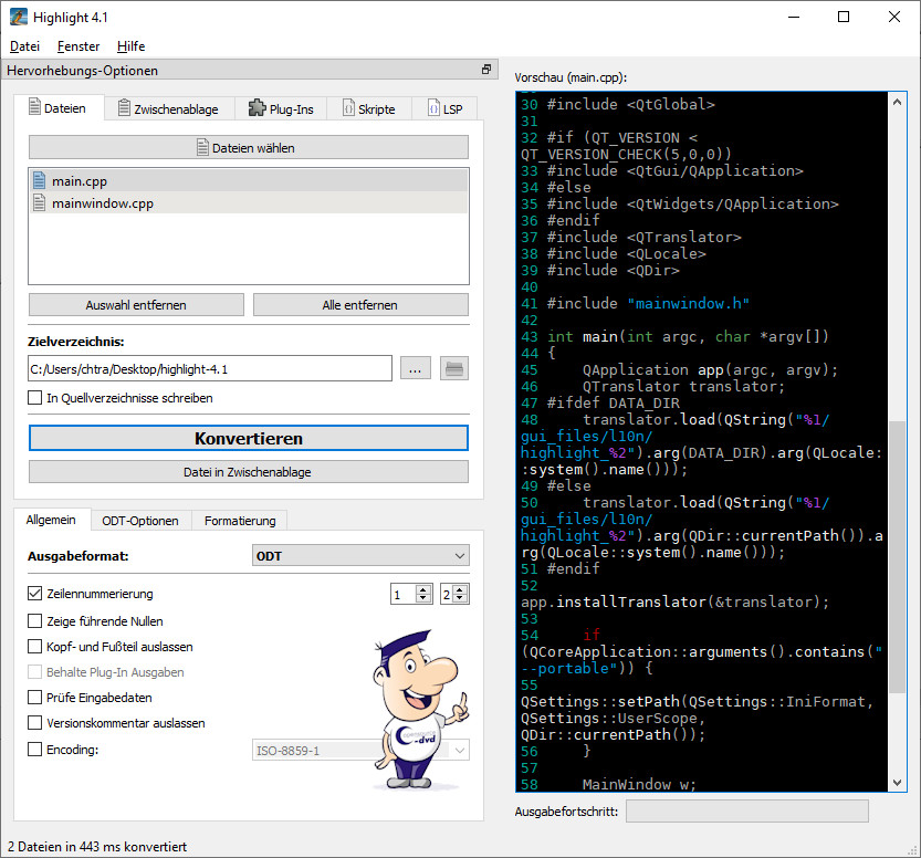 Highlight konvertiert Quellcode in formatierten Text mit Syntax-Hervorhebung. Es unterstützt weit über 200 Programmiersprachen. Dazu zählen u. a. ASP, Assembler, BlitzBasic, C++, CMake, CSS, DOS-Batch, Eiffel, Fortran, HTML, Java, JavaScript, LaTeX, Pascal, Perl, PHP, PowerShell, Python, Ruby, TCL, Visual Basic und XML. Der konvertierte Quellcode wird in Formate wie HTML, LaTeX, ODT, RTF, SVG, TeX und XHTML abgespeichert. Möchten Sie bspw. den Quellcode in eine Textverarbeitung importieren, empfiehlt sich ODT oder RTF als Zielformat. Fügen Sie zunächst die Dateien mit dem Quellcode in die Liste ein. Dazu klicken Sie auf den Button "Dateien wählen" oder Sie ziehen Dateien per Drag & Drop auf das Highlightfenster.