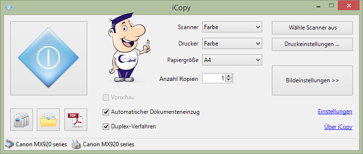 Wer Scanner und Drucker sein eigen nennt, kann sie mit iCopy zu einem Kopiergerät vereinen. Vorlage einlegen, die Anzahl der Kopien bestimmen, den Button "Starte Kopiervorgang" drücken und schon kommt die fertige Kopie aus dem Drucker. In den Bildeinstellungen verstellen Sie mit einem Regler Helligkeit und Kontrast, die Qualität sowie die Größe. iCopy liefert Schwarz-Weiß-, Graustufen- oder Farbkopien.