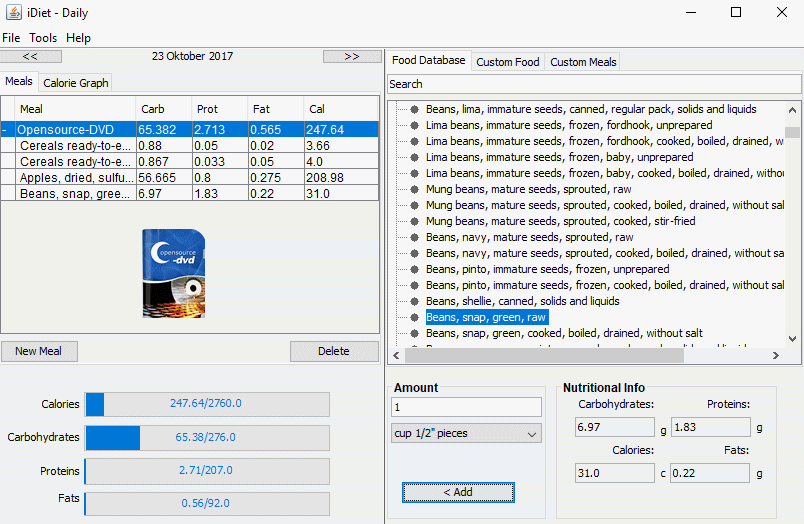 Von hier aus fügen Sie das ein, was zu einem Mahl gehören soll. Links erfahren Sie den aktuellen Protein-, Fett- und Kohlehydratanteil sowie die Anzahl der Kalorien dieser Mahlzeit. Mit Save im Filemenü speichern Sie Ihre Daten. Zusätzliche Sicherheit bietet die Backupfunktion. Der Passwortschutz soll in einer späteren Version funktionieren.