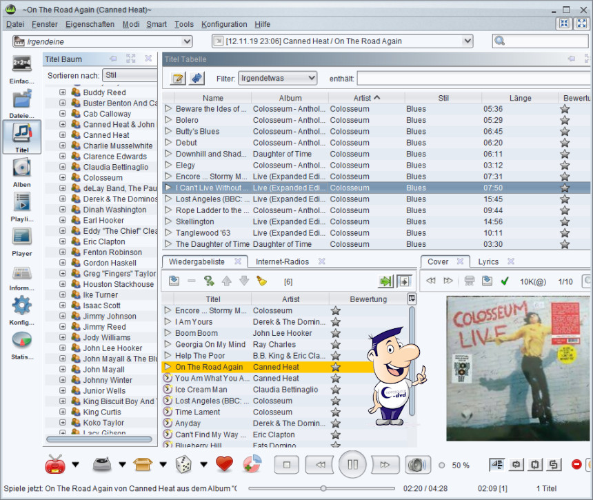 Bei Bedarf lassen sich die Felder der ID3-Tags (v1 und v2) u.a. von MP3- und OGG-Dateien bearbeiten. Jede Kollektion bzw. Playliste versehen Sie mit einem passenden Namen. Eine GIF-, JPG- oder PNG-Bilddatei, die sich im Quellordner befindet, wird als Cover angezeigt. Best of und Bookmarks sind gesonderte Playlisten, denen Sie beliebige Tracks der Kollektionen zuordnen können. Die Statistische Ansicht informiert Sie bspw. über Größe pro Quelle und Musikrichtung.