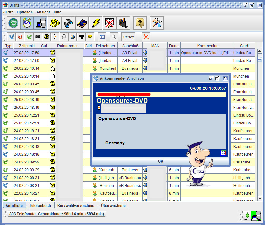 JFritz liest Anrufliste, Telefonbuch und Kurzwahlverzeichnis Ihrer Fritz!Box-Fon-Anlage aus und stellt die Daten in übersichtlichen Tabellen dar. In der Anruferliste wird einer Rufnummer der entsprechende Name, die Adresse und ggf. ein Bild aus dem Telefonbuch zugeordnet. Für Rufnummern, die nicht in Ihrem Telefonbuch eingetragen sind, kann die integrierte Rückwärtssuche diese Daten aus dem Internet holen. Ankommende Anrufe zeigt JFritz in einem Fenster an. Dazu muss allerdings ein Anrufmonitor vorhanden sein. Empfehlenswert ist der interne Anrufmonitor der Fritz!Box. Er wird durch das Anwählen mit #96*5* aktiviert. Das Deaktivieren erreichen Sie mit #96*4*.