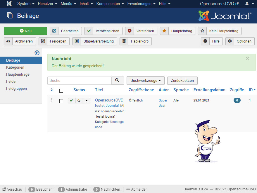 Joomla! wechselt nun automatisch in den Ordner "installation" und startet die Installation. Nach erfolgreichem Installieren müssen Sie dieses Verzeichnis löschen. Auf der Startseite klicken Sie im Quellenmenü auf Administrator und loggen sich als Admin ein. Jetzt befinden Sie sich im Kontrollzentrum. Melden Sie hier weitere Benutzer an, die bei Ihrem Projekt mithelfen, erstellen Menüs und Inhalte, fügen Komponenten wie Feeds, Umfragen und Internetlinks ein oder (de-)aktivieren Erweiterungen. Mails an Mitbenutzer senden Sie über das Komponenten-Menü. Die Auswirkungen Ihrer Änderungen lassen sich vorab mit der Vorschaufunktion betrachten. Auf der Entwicklerhomepage werden zusätzliche Erweiterungen angeboten. Dazu zählen ein dynamischer Formularbauer, eine Dokumentverwaltung, Bilder- und Multimediagalerien und eine Forum- und Chatsoftware.