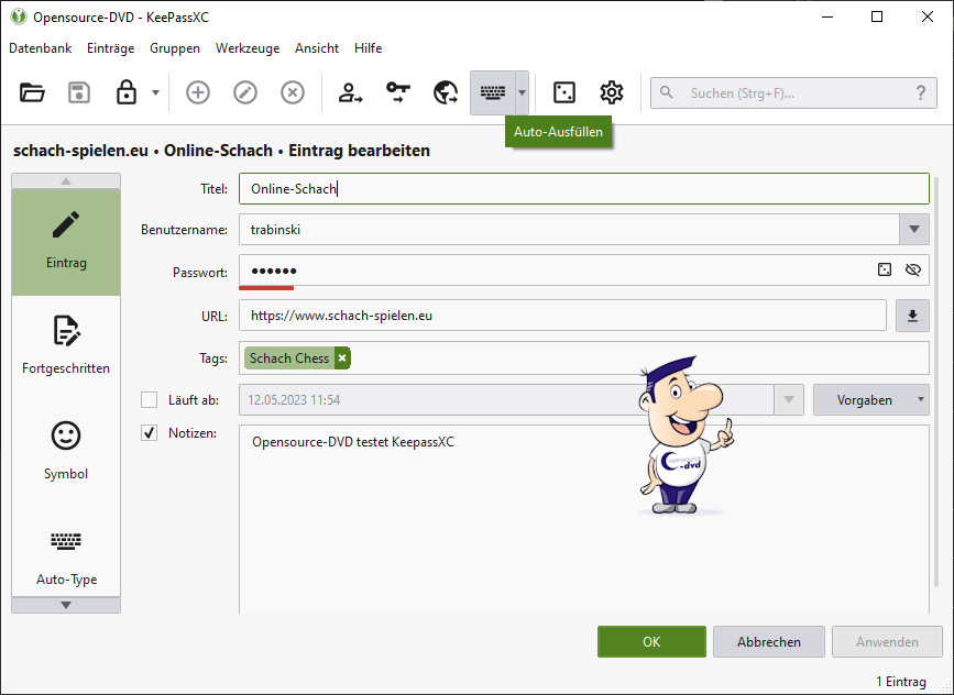 Jeder Eintrag wird von KeePassXC bis zu dem Zeitpunkt unter "Läuft ab" als gültig betrachtet. Die Daten übertragen Sie über die Zwischenablage in ein Onlineformular. Noch schneller geht es jedoch mit der Funktion Auto-Type, die alle Daten eines Eintrags kopiert und sie durch vorgegebene Tabulatoren den richtigen Feldern zuweist. Über das Einträge-Menü können Sie z. B. für eine sichere Zwei-Faktor-Authentifizierung ein zeitlich begrenzt gültiges, nur einmalig nutzbares Passwort (TOTP - Time-based One-time Password) erzeugen. Die Datenbanken lassen sich in die Formate HTML, CSV oder XML exportieren. CSV-Dateien eignen sich für den Datenimport. Die Browser-Integration aktivieren Sie in den Einstellungen. Das Programm setzt
