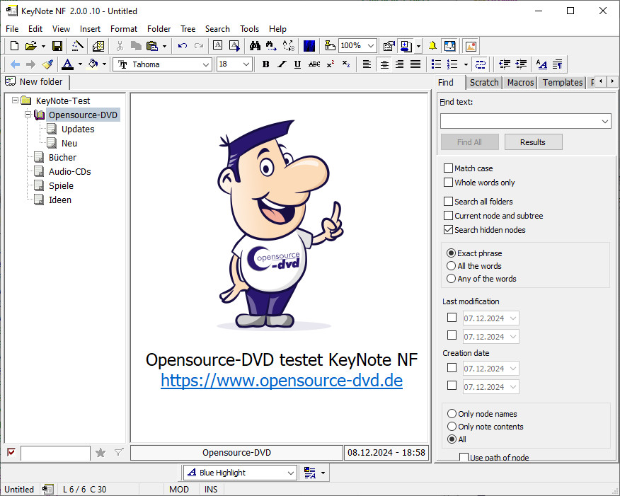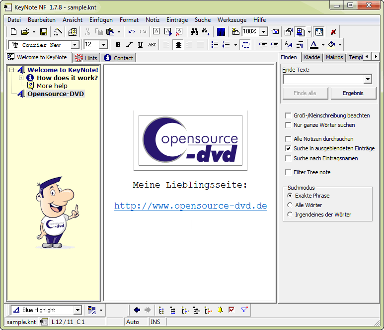 Ordnung ist das halbe Leben! Wenn Sie Bücher, CDs, Schallplatten, Kochrezepte oder Texte am PC verwalten möchten, dann kommen Sie an dem multifunktionalen KeyNote einfach nicht vorbei. Das Programm versteht sich als Volltextdatenbank, also eine praktische Kombination aus Textverarbeitung und Datenbank. Mit einem Windows-Explorer-ähnlichem Look & Feel legt man zunächst einzelne Kategorien an und füllt diese dann mit den entsprechenden Einträgen. Neben der Texteingabe lassen sich auch komplette Dateiinhalte, Internet-Links sowie Bilder in Formaten wie PNG, BMP, GIF und WMF einbinden.