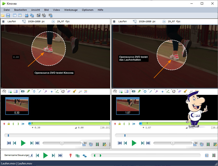Erfassen, Beobachten, Anmerken und Messen - Kinovea dient zur nachträglichen Analyse sportlicher Aktivitäten, die als Video aufgezeichnet wurden. Als Werkzeuge zur Untersuchung der Bewegungsabläufe stehen Zeitlupe und Zeitraffer zur Verfügung. Zudem lassen sich zwei unterschiedliche Videos gleichzeitig oder das gleiche Video in unterschiedlichen Ansichten abspielen (Ansicht - Zwei Wiedergabefenster). Jede Szene kann als "Schlüsselbild" abgespeichert werden, aus denen Kinovea auf Wunsch eine Diashow erstellt. Vergrößern Sie mit der Lupe Bildausschnitte oder fügen eine Stoppuhr in das Bild ein.