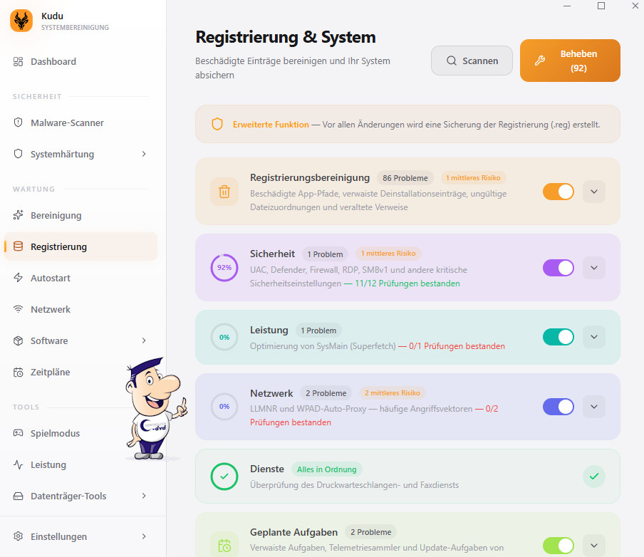 Kudu präsentiert sich als modernes All-in-One-Tool für Systemoptimierung, das Reinigung, Malware-Erkennung und Performance-Monitoring in einer übersichtlichen Oberfläche vereint. Trotz seines großen Funktionsumfangs bleibt die Bedienung dank klar strukturierter Kategorien und prägnanter Beschreibungen auch für weniger erfahrene Nutzer zugänglich. Beim Start empfängt Sie ein intuitives Dashboard, das Echtzeitdaten zu CPU-, Arbeitsspeicher- und Datenträgerauslastung liefert. Von dort aus lassen sich mit nur einem Klick sowohl schnelle als auch umfassende Bereinigungsprozesse starten, die zuverlässig temporäre Dateien, Protokolle, Cache-Daten von Browsern und Spiel-Launchern, Shader-Reste, Absturzberichte sowie verbliebene App-Daten entfernen. Besonders durchdacht ist die Vorgehensweise bei der Registry-Bereinigung: Vor jeder Optimierung wird automatisch eine Sicherung der aktuellen Einträge erstellt, die im Verzeichnis C:\Users\[Benutzer]\Documents\Kudu Backups\ abgelegt wird. Der integrierte Sicherheitsbereich bietet Schutz vor Malware, Funktionen zur Wahrung der Privatsphäre und ermöglicht die Kontrolle über im Hintergrund laufende Dienste.