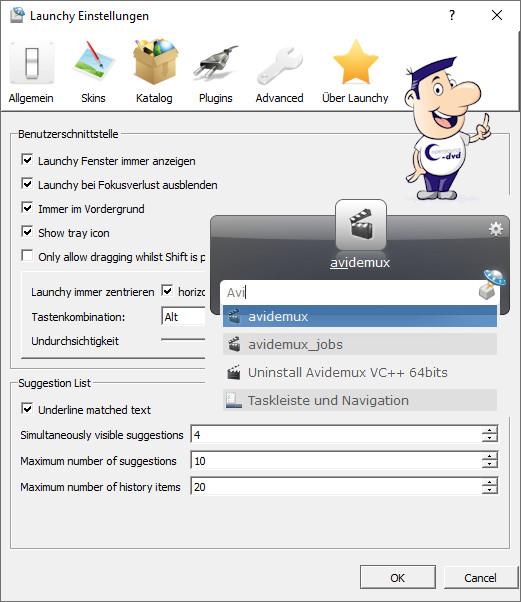 Sobald das Programm in den Vordergrund geholt wird, erscheint im History-Feld stets das zuletzt über Launchy gestartete Programm. Mit ENTER könnte man es sofort wieder ausführen. Mit der rechten Maustaste gelangen Sie zu den Programmeinstellungen. Hier ändern Sie die Launchy-Oberfläche (Skins), bestimmen die Verzeichnisse (Katalog), die das Tool durchsuchen soll und ändern den Hotkey ALT/Leertaste. Im Allgemein-Register weisen Sie Launchy an, immer sichtbar zu bleiben und weisen ihm einen beliebigen Grad an Transparenz zu.