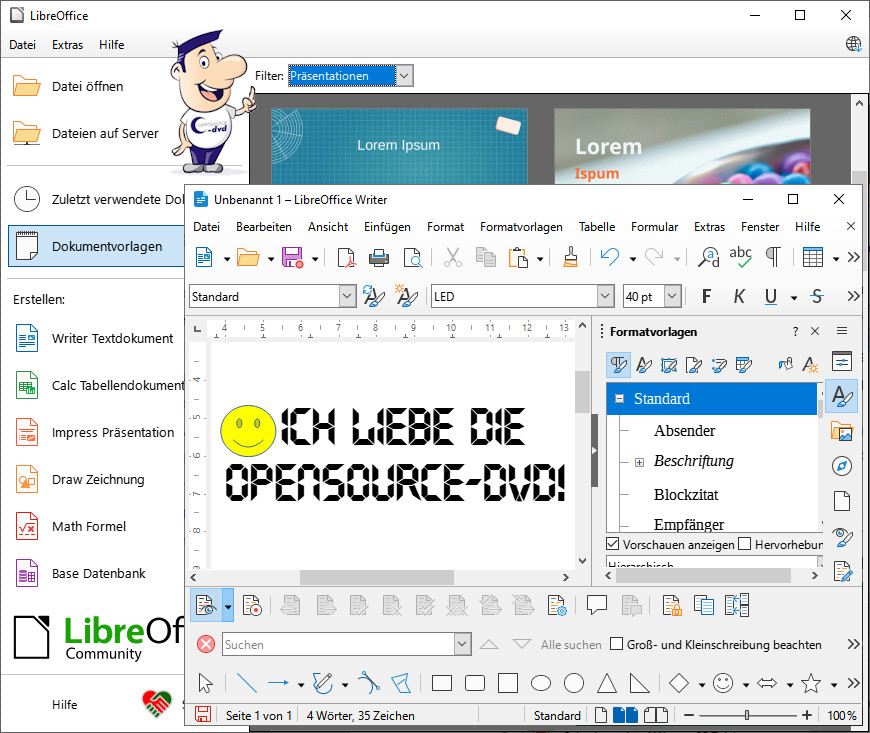 Zum Bearbeiten lassen sich Fremdformate wie PDF (!) sowie Microsofts XLSX, PPTX, DOC und DOCX importieren. Der mitgelieferte Extension-Manager vereinfacht das Hinzufügen von Programm-Erweiterungen. Zahlreiche Vorlagen, der Zugriff auf Clouddienste wie Google Drive und OneDrive sowie viele weitere Vorzüge machen LibreOffice zu einer sehr empfehlenswerten Alternative zu den kostenpflichtigen Pendants. Die