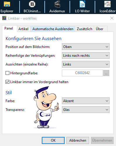 Linkbars, die Sie schließen, erscheinen nach einem Programmneustart wieder. Nur gelöschte ("Löschen Sie die Linkbar") tauchen nicht mehr auf. Vorsicht: Wenn Sie hier zusätzlich "Lösche Arbeitsverzeichnis" aktivieren, wird alles in diesem Ordner einschließlich der Unterordner in den Papierkorb verschoben. In den Programm-Eigenschaften passen Sie die Position und Größe (Ränder) der Linkbar an. Die Icongröße lässt sich auf bis zu 256 Pixel einstellen. Unter "Textpositionierung" bestimmen Sie, ob zum Icon auch der Verknüpfungstext gezeigt werden soll. Ist das "Automatische Ausblenden" aktiviert, machen Sie die Linkbar durch eine vorgegebene Mausaktion bzw. Tastenkombinationen wieder sichtbar.