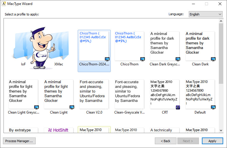 Vorschaubilder zeigen, wie die Schrift des jeweiligen Profils aussehen würde. Für alle, die 3D-Effekte lieben, könnte sich bspw. ein Blick auf XMac.CRT im XMac-Ordner lohnen. Der Wechsel zu einem anderen Profil ist außerdem nach einem Klick der rechten Maustaste auf das Trayicon möglich. Zum Ändern oder Erstellen eines Profils rufen Sie das "Control Panel" (Open profile - Open with MacType Tuner) auf. Für das Hinzufügen des Profils ist der Wizard zuständig. Per Doppelklick auf das Trayicon erhalten Sie eine Liste der laufenden Prozesse und die Meldung, ob MacType auf deren Schriftbild zugreifen kann (Running).