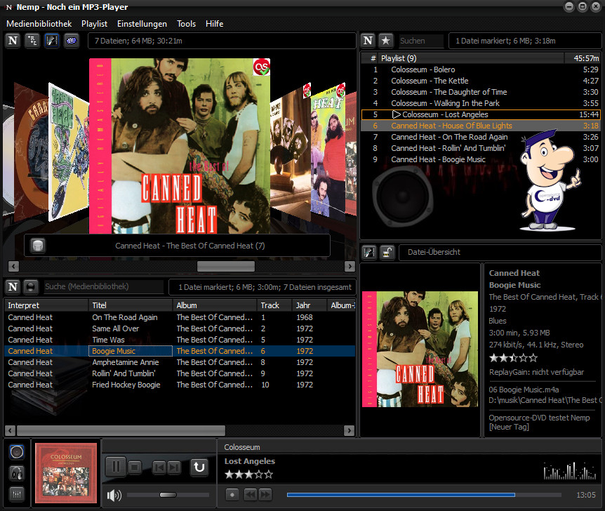Nemp spielt nicht nur alle gängigen Audioformate wie MP3, OGG, WMA, WAV, APE, FLAC, M4A, Audio-CD und AAC(!), sondern bringt auch Ordnung in Ihre Musiksammlung. Darüber hinaus wartet es mit vielen weiteren Funktionen auf. Zuerst importieren Sie Ihre Audiodateien. Dazu teilen Sie Nemp mit, in welchem Ordner sie sich befinden (Medienbibliothek - "Verzeichnis hinzufügen"). Bestätigen Sie dabei "Soll Nemp dieses Verzeichnis überwachen?", damit das Programm neue Songs in diesem Verzeichnis automatisch in die Bibliothek aufnimmt. Links oben haben Sie Zugriff auf die Medienbibliothek in der Coverflow-, Tagwolke- oder Dateienansicht. Hier wählen Sie einen Song oder eine CD aus. Darunter werden dann die ausgewählten Titel aufgelistet. Klicken Sie auf einen mit der rechten Maustaste, so eröffnen sich zahlreiche Möglichkeiten wie das Abspielen eines Tracks, das Übertragen in eine Playliste (rechts oben) und das Berechnen der ReplayGain-Werte, um die Lautstärke automatisch so anzupassen, dass alle Titel aus verschiedenen Quellen (in etwa) gleich laut klingen. Mit "Im Kopfhörer abspielen" lassen sich über den Lautsprecher und einem Kopfhörer verschiedene Stücke abspielen.