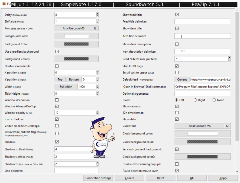 . Eine andere mögliche Art der Verwendung ist das Erinnern an bestimmte Aufgaben und Termine. Dazu tragen Sie den Text, der erscheinen soll, in eine Textdatei ein und übertragen den Pfad dazu nach "Open Text File". In den Eigenschaften (Edit - Full Settings) bestimmen Sie, nach welchem Zeitraum die News aktualisiert werden sollen.