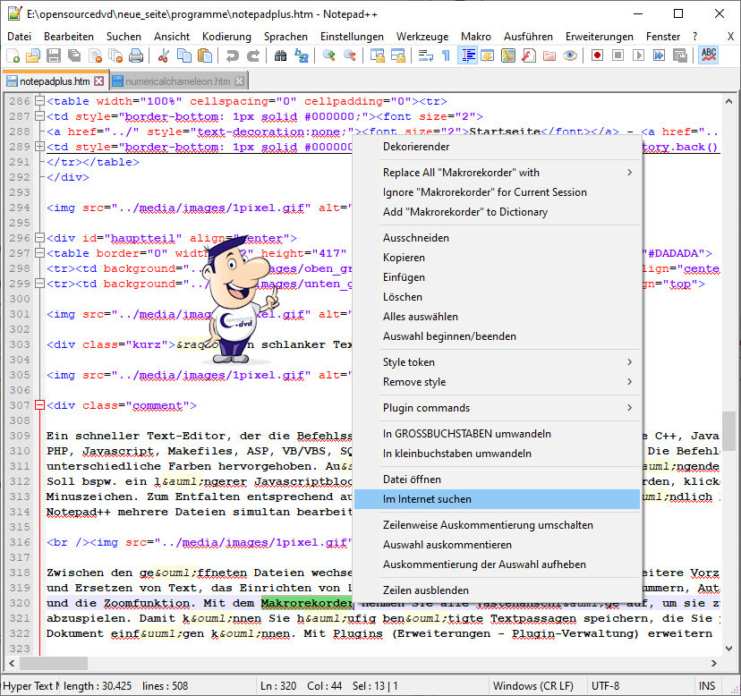 Zwischen den geöffneten Dateien wechseln Sie mit einem Klick auf deren Tabs. Weitere Vorzüge von Notepad++ sind das Suchen und Ersetzen von Text, das Einrichten von Lesezeichen innerhalb des Textes, Zeilennummern, Autovervollständigung, Rechtschreibprüfung und die Zoomfunktion. Mit dem Makrorekorder nehmen Sie alle Tastenanschläge auf, um sie zu einem späteren Zeitpunkt wieder abzuspielen. Damit können Sie häufig benötigte Textpassagen speichern, die Sie per Hotkey jederzeit in ein beliebiges Dokument einfügen können. Mit Plugins (Erweiterungen - Plugin-Verwaltung) erweitern Sie die Funktionspalette.