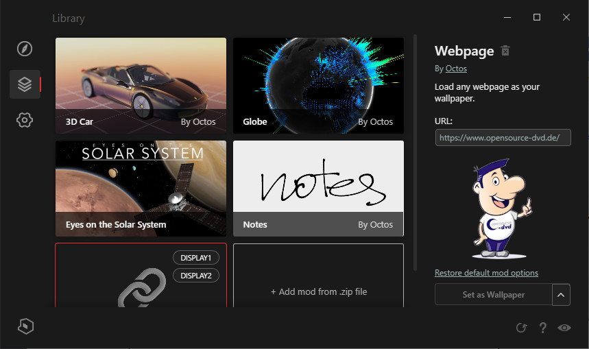 Peppen Sie Ihren Desktop durch faszinierende interaktive Hintergründe auf. Die animierten Wallpaper nennen sich hier Mods und werden unter "Explore mods" aufgelistet. Mit "Added to library" übertragen sie einen in die Bibliothek, von der aus er mit "Set as Wallpaper" aktiviert wird. Nutzer mehrerer Bildschirme können festlegen, ob ein Mod nur auf einem bestimmten oder allen erscheinen soll. Unser persönliches Highlight ist das "Solar System", eine Liveansicht unseres Sonnensystems. Mit der Maustaste drehen oder zoomen Sie die Ansicht. Durch das Ziehen eines Kreises ("Real Rate") nach links oder rechts blicken Sie in die Vergangenheit bzw. in die Zukunft.