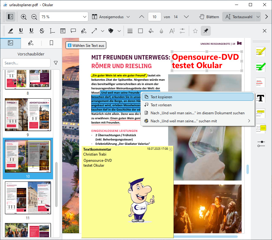 Der universelle Dokumentenbetrachter Okular ist schnell, vollgepackt mit Funktionen und ermöglicht das Öffnen von PDF-Dokumenten, Comic- und E-Books (CB7, CBR, CBT, CBZ, EPUB, MOBI, PCR), Bildern, FictionBooks (FB2) und mehr. Mit den Anmerkungen können Sie (Haft-)Notizen, Text, Kommentare, Pfeile, Linien, Rechtecke, Vielecke und Lesezeichen hinzufügen, Texte kopieren, markieren und unterstreichen sowie mit Texten wie "Streng geheim", "Vertraulich" und "Freigegeben" stempeln. In der Seitenleiste gibt es eine Vorschau aller Seiten des Dokuments. Im Präsentationsmodus werden die Seiten wie in einer Diashow nacheinander angezeigt.