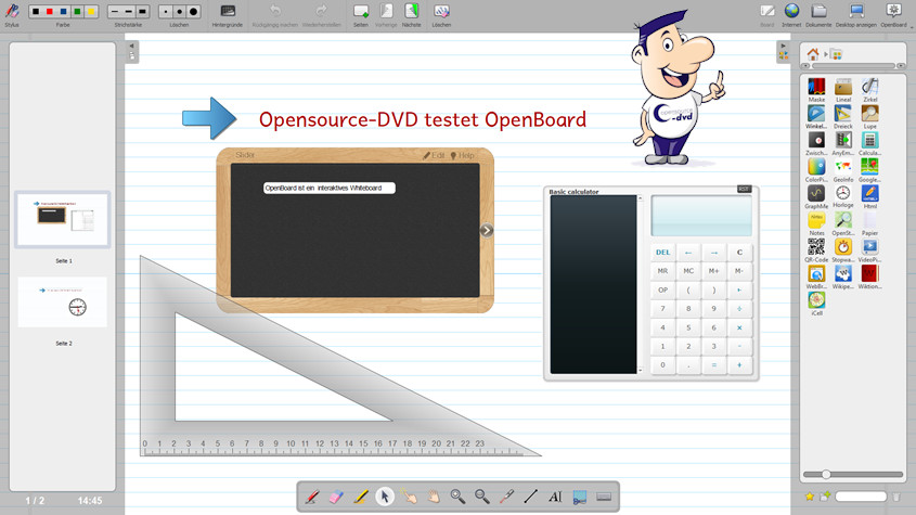 Mit OpenBoard erstellen Sie Präsentationen, Anleitungen, Vorträge für jeden beliebigen Zweck. Optional lassen sich die Dokumente interaktiv gestalten. Je nach Ihren Vorgaben werden die Whiteboard-Seiten liniert, kariert sowie hell oder dunkel dargestellt. In jedem Dokument können Sie mehrere Seiten anlegen. Die Werkzeugleiste verfügt über Stift, Marker, Radiergummi, Laserpointer, Objekt auswählen, Zoom und Textfeld. Mit "Teil des Bildschirms erfassen" kopieren Sie einen Bereich im Dokument in die gleiche Seite, in eine neue Seite oder in die Bibliothek. Diese Funktionen lassen sich zudem auf andere Programme anwenden, wenn Sie auf den Button "Desktop anzeigen" klicken. Zu den Highlights des Programms gelangen Sie durch einen Klick auf den Tab oben rechts. Lineal, Winkelmesser, Dreieck, Zirkel, Notizzettel, Lupe, Taschenrechner, Uhr, Stoppuhr und vieles mehr finden Sie im Bereich Anwendungen.