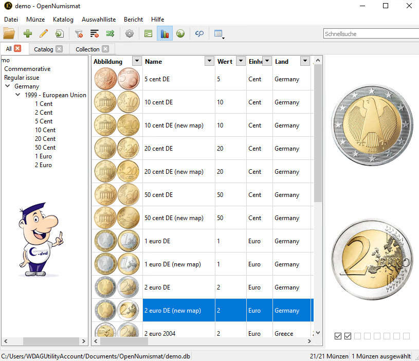 OpenNumismat ist eine gute Wahl für alle Münzensammler, die eine Software zum Katalogisieren Ihrer Schätze suchen. Eine Demodatenbank für Euromünzen erleichtert den Einstieg in die Programmbedienung. In den zahlreichen Feldern zu jeder Münze können Sie eine Vielfalt an Daten festhalten. Dazu zählen Beschreibung des Münzrandes sowie der Vor- und Rückseite, Wert, Prägejahr, Qualität, Metall, Durchmesser, Dicke, Gewicht, Katalognummer und -preis. Diese gesammelten Informationen werden auf Themen-Register wie Münze, Handelsplatz, Tags, Design, Klassifizierung verteilt.