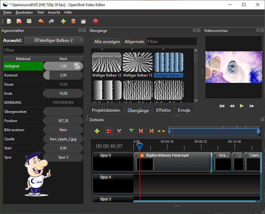 Weitere mögliche Arbeitsschritte sind das Trennen in eine Video- und Audiospur, das Zerteilen eines Clips oder das Einfügen von Übergängen. Dutzende Effekte für Bild und Ton stehen Ihnen außerdem zur Verfügung. Jeder Effekt hat unterschiedliche Eigenschaften, die Sie per Doppelklick auf das Symbol des Effekts öffnen. In der "Videovorschau" sehen Sie, wie sich die vorgenommenen Änderungen auswirken. Für das Exportieren Ihres Projekts wählen Sie eine der zahlreichen Profilvorlagen sowie ein Zielformat wie MP4, MKV, WebM, OGG, AVI, FLV oder MOV aus.