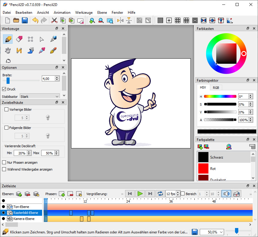 Pencil2D erhebt Sie in den Stand eines Regisseurs, der sich in der Kunst des Zeichentrickfilms ausleben darf. Eine Animation besteht aus mindestens einer Ebene (Layer). Eine Ebene selbst setzt sich aus einzelnen Frames zusammen. Die Anzahl der Ebenen bestimmen Sie über das gleichnamige Menü. Neben Bitmap- oder Vektor-Grafiken lassen sich Sound- oder Videodateien sowie Kameraeinstellungen als Ebenen einrichten. Das Werkzeuge-Menü bietet zum Zeichnen eine Standardausrüstung wie Bleistift, Pinsel, Fülleimer und Linien. Mit "Auswählen" markieren Sie Bereiche, die dann für sich bearbeitet werden können.