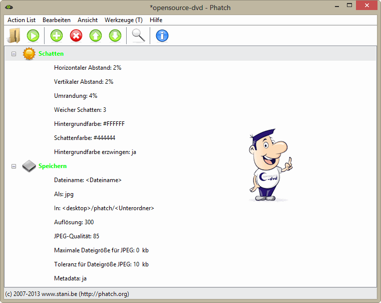 Der Name Phatch (PHoto und bATCH) deutet bereits an, worauf deren Macher ihr Hauptaugenmerk richten. Gemeint ist die Stapelverarbeitung, das Anwenden immer gleicher Arbeitsschritte auf eine ganze Serie von Bildern. In Phatch beginnen Sie mit dem Festlegen der Aktionen, erst dann wählen Sie die Bilder, auf die sie anzuwenden sind. Angenommen, Sie möchten eine Reihe von Bildern mit einem Schatten versehen. Klicken Sie auf den Plus-Button (Aktion hinzufügen) und wählen die Aktion "Schatten" aus. Ändern Sie ggf. die Feineinstellungen wie Schattenfarbe und -größe. Bei Bedarf könnten Sie nun weitere Aktionen ergänzen. In unserem Beispiel setzen wir nur noch die stets erforderliche Speichern-Aktion, mit der Sie das Zielformat wie JPG, PNG, PCX, GIF, TIF oder BMP bestimmen.