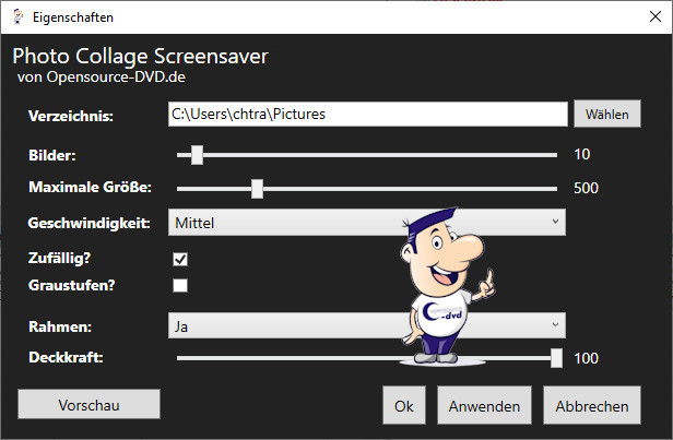 Photo Collage Screensaver positioniert Ihre Lieblingsbilder nacheinander an beliebigen Stellen Ihres Desktops. In den Einstellungen wählen Sie das Verzeichnis mit Ihren Bildern aus; der Bildschirmschoner berücksichtigt auch die Unterordner. Die Anzahl der Bilder, die gleichzeitig zu sehen sind, ist mindestens 5 bis maximal 100.